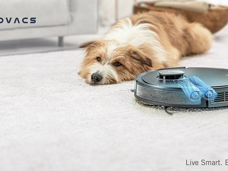 Ecovacs - yläbanneri, jossa on makaava koira sekä robotti-imuri