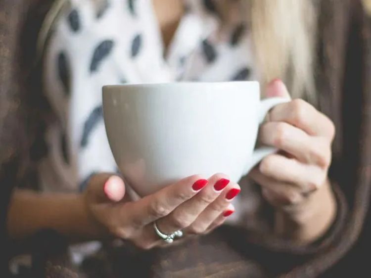 Lähikuva naisesta suuri kahvi kuppi kädessään