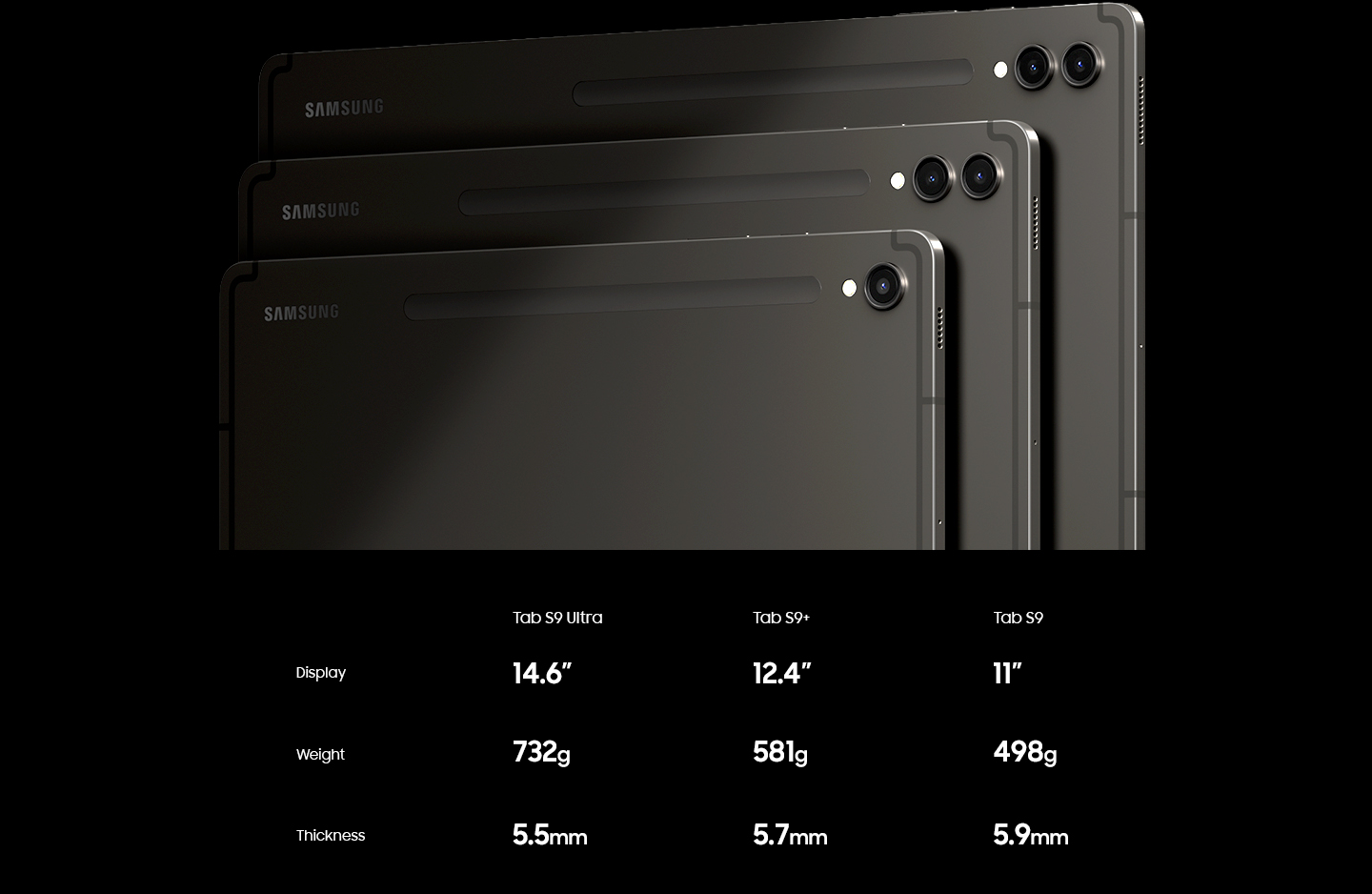 Tutustu Samsungin uusiin premium-tason tabletteihin Galaxy Tab S9, Galaxy Tab S9+ ja Galaxy Tab S9 Ultra. Osta itsellesi tabletti, joka toimii sekä kannettavana luovana studionasi että tehokkaana työpisteenäsi, jossa ideasi, visiosi ja vaativat tehtäväsi saavat tarvitsemansa tilan. Se on luottolaite huipputehoiseen pelaamiseen ja sillä voit nähdä elokuvat fantastisen immersiivisellä äänellä, aivan kuin olisit elokuvateatterissa. Kun vielä otetaan huomioon Samsung Galaxy Tab S9:n elegantin ohut ja kestävä design, tulee siitä helposti mukana kannettava ja monikäyttöinen suosikkilaite. Tabletti on saatavilla kolmessa eri koossa, joista löydät helposti omiin tarpeisiisi sopivan laitteen!