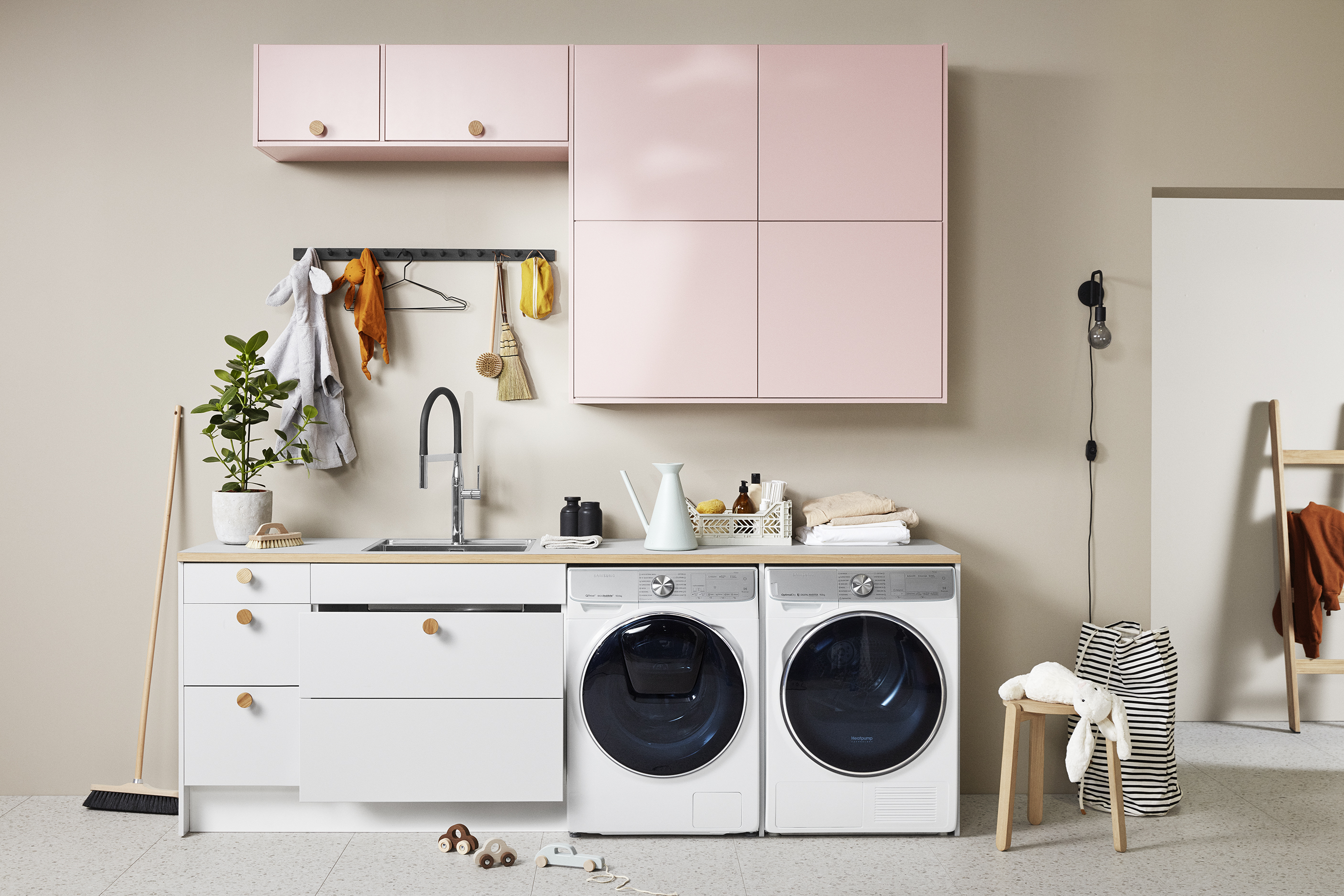 Pesuaineen pitäminen lähellä pesukonetta tai työtasolla kuivausrummun vieressä on loogista. Kuivausrummun sijoittaminen pesukoneen päälle säästää paljon tilaa. Laitteiden sijoittaminen vierekkäin luo kuitenkin arvokasta työtilaa niiden päälle. Voit myös integroida pesukoneen ja kuivausrummun kaappiratkaisuun. Näin laitteet nostetaan mukavammalle korkeudelle ja samalla voit hyödyntää niiden alla olevaa tilaa laatikoille.