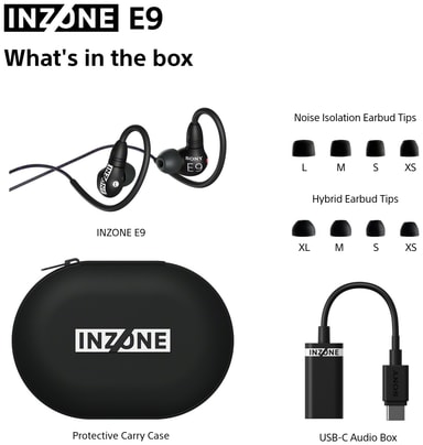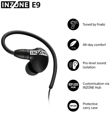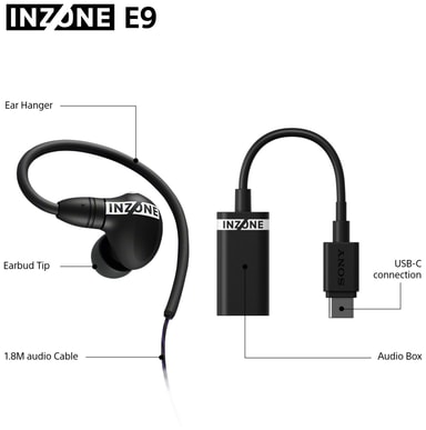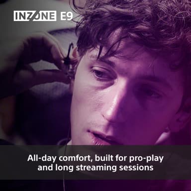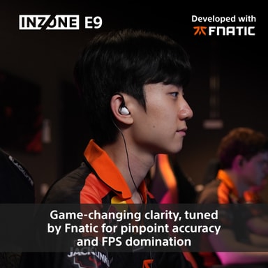 Sony Inzone E9 In-Ear -pelikuulokkeet ovat FPS-optimoidut kuulokkeet, jotka on kehitetty yhteistyössä Fnatic-organisaation kanssa. Niissä on melua eristävät korvatulpat, USB-C-äänilaatikko 360 Spatial Sound -teknologialla, taajuuskorjain INZONE Hubin kautta sekä 3,5 mm ja USB-C-liitännät. Kevyet kuulokkeet, joissa on kaksi kuulokepäätä, tarjoavat selkeän äänen, mukavuuden ja kilpailukykyisen keskittymisen.