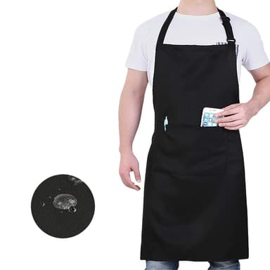 Vettä ja öljyä hylkivä: Tämä musta työesiliina on valmistettu vettä hylkivästä ja öljyä hylkivästä materiaalista, joka estää tehokkaasti nesteiden ja rasvan tunkeutumisen. Tämä varmistaa, että vaatteesi pysyvät puhtaina työskennellessäsi keittiössä, grillillä tai muissa sotkuisissa ympäristöissä.