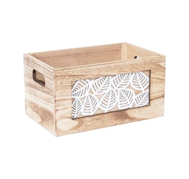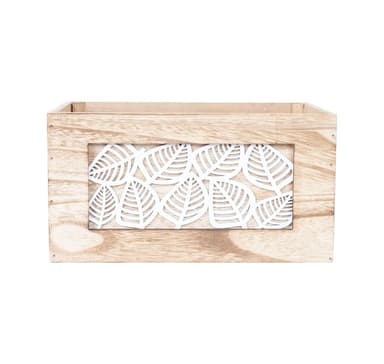 Puinen rasia KASEKE 36x26x18cm, luonnonvärinen. Rasia on valmistettu vanerista ja massiivipuusta. Toinen sivupaneeli on koristeltu valkoisilla lehtiaiheilla. Kevyesti poltettu ja harjattu pinta paljastaa puun luonnollisen syykuvion hienot yksityiskohdat.