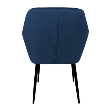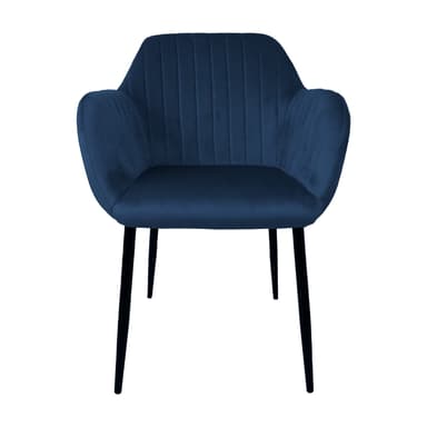 Tuoli EVELIN tummansinistä samettia. Mukava istuin on kevyesti pehmustettu ja kokonaan peitetty ruskeanharmaalla samettikankaalla. Päällysmateriaali: 100% polyesteri. Istuinrunko: metallia ja vaneria. Verhoilu: polyuretaanivaahto. Mustaksi pulverimaalatut metallijalat. Tuolin kokonaismitat ovat 58x59xH81cm. Istuinleveys 37 cm, istuinsyvyys 39 cm, istuinkorkeus 46 cm. Käsinojan korkeus maasta on 65 cm. Painorajoitus 120kg.