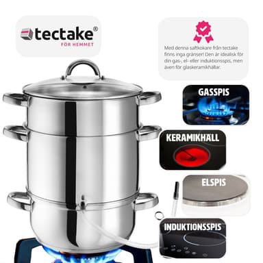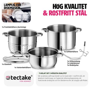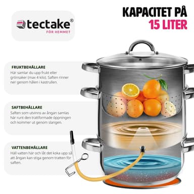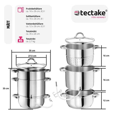 Tectaken käytännöllisellä höyrymehupuristimella valmistat nopeasti ja helposti omaa mehua. Mikä herkku! Tämä höyrymehustin on valmistettu ruostumattomasta teräksestä ja se kestää jopa 4 kg hedelmiä.Tutustu ominaisuuksiin