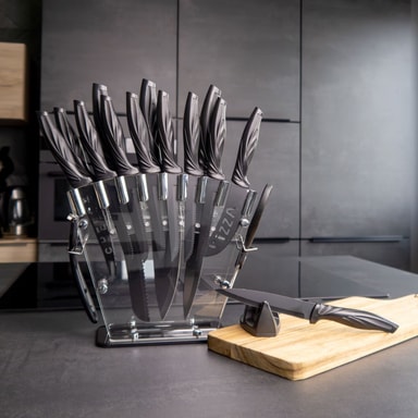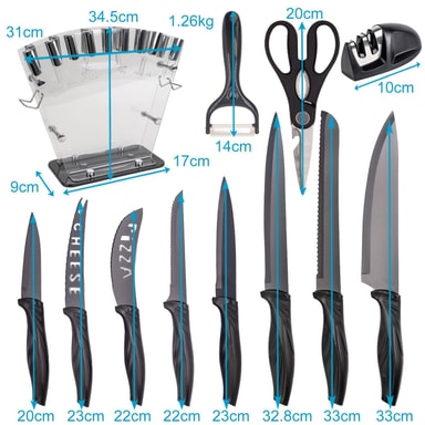 Ei vain kotona, mutta myös ravintolassa, Veitsilohko sopii erinomaisesti hotelleihin tai ruokailuun. Siinä on myös 6 pihviveistä, kuorimakone ja monitoimisakset, joilla voit murskata jopa saksanpähkinöitä.. 17 kpl:n setti sisältää teroittimen, on helppo puhdistaa ja on vakaa, vankka ja kestävä. Setti soveltuu leivän, vihannesten, hedelmien, lihan, kalan, juuston ja pizzan leikkaamiseen.Materiaali on ruosteenkestävä, kevyt ja tarttumaton pinnoite. Ja kompaktin rakenteen ansiosta setti voidaan säilyttää keittiössä tilan säästämiseksi Tuotetiedot: Musta, hiilikahva, ruostumaton teräs, 36 x 11,5 x 23,5 cm.