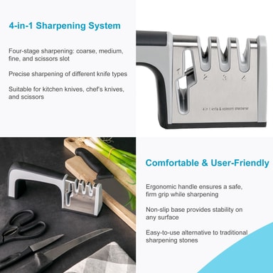 4-in-1 veitsimylly, joka on valmistettu ruostumattomasta teräksestä saksille ja keittiöveitsille - sopii teräkselle ja keramiikalle karkea ja hieno hionta liukumattomalla pohjalla