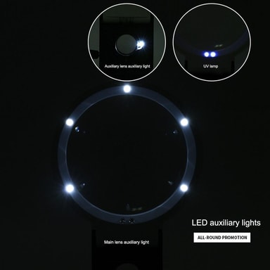 Suurennus on vaihdettavissa lukemateriaalin ja suurennuslasin välisen etäisyyden mukaan. 6 kpl mini-LED-valo+2 kpl UV-valoja käytetään käteisrahan, kolikoiden, postimerkkien keräämisen ja muiden toimialojen tunnistamiseen. Ihante ellinen hienojen tulosteiden tutkimiseen sanomalehtien, asiakirjojen, karttojen, valokuvien, käsitöiden, käsitöiden jne. Minikoko, helppo viedä minne tahansa ilman lataushuolia Tekniset tiedot:
