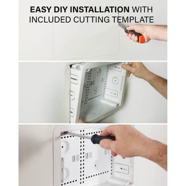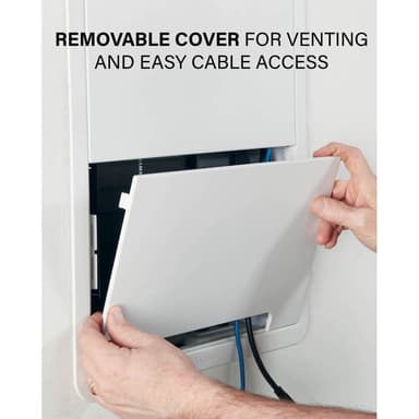 Tämä laatikko on helppo asentaa leikkaamalla aukko seinään television taakse. Laatikko on valmistettu läpinäkyvästä Wi-Fi-materiaalista langattomien komponenttien hallintaa varten. Pakkaus sisältää laatikon, koristerenkaan, kannen, koukku- ja silmukkahihnan, ylimääräisen asennuslevyn, täydelliset ohjeet ja leikkausmallin asennuksen helpottamiseksi.
