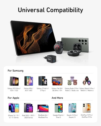 Anker 313 USB-C 45W Ace Laturi tarjoaa ultra-nopean latauksen jopa 45 W tehoilla, jolloin voit ladata Samsung Galaxy S23 Ultran täyteen alle tunnissa. Täydellinen nopeaan ja turvalliseen laitteidesi lataamiseen. Varustettu 10 turvallisuusominaisuudella, kuten oikosulkusuojalla, ylijännitesuojalla ja lämpötilanvalvonnalla, jotka suojaavat sinua ja laitteitasi.Tekniset tiedot: