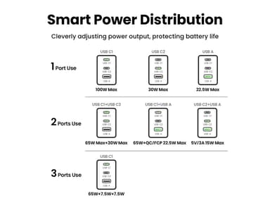 1 portin lähtö: USB-C1 100W, USB-C2: 30W, USB-A 22,5W