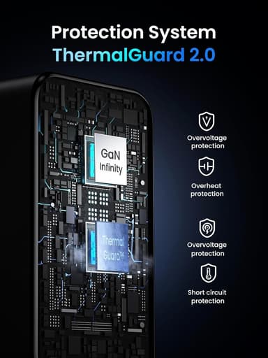 Tuote on varustettu Thermal Guard 2.0- ja GaN-teknologialla, mikä antaa sille erittäin hyvän suorituskyvyn ja erinomaisen suojan ylijännitettä, oikosulkua, ylivirtaa ja ylikuumenemista vastaan.