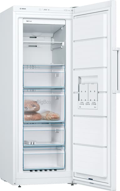 GSN29VWEP: Tyylikäs, valkoinen 200 litran Bosch-pakastin, jossa on NoFrost-tekniikka, VarioZone-joustavuus ja tehokas SuperFreeze-toiminto.Tutustu ominaisuuksiin