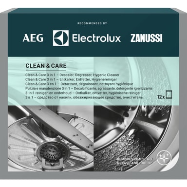 Clean&Care 3in1. Kalkinpoistoaine, rasvapoistoaine ja desinfioitiaine astian- ja pyykinpesukoneille yhdessä pussissa. Poistaa kalkkisaastumia, rasvaa ja hajuja jättäen raikkaan ja puhtaan koneen. Sisältää 12 x 50 gr pusseja.Tutustu ominaisuuksiin