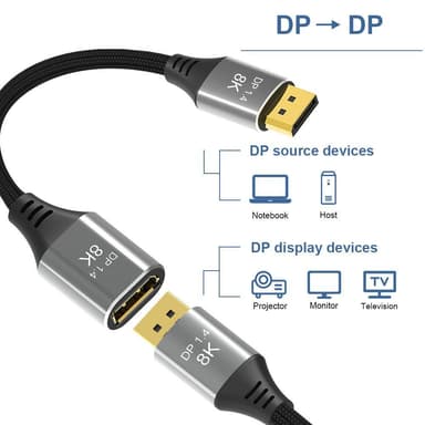NÖRDIC 50 cm Displayport 1.4 jatkokaapeli UHD 8K60Hz 4K144Hz 32.4Gbps 10-bittinen HDR