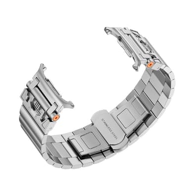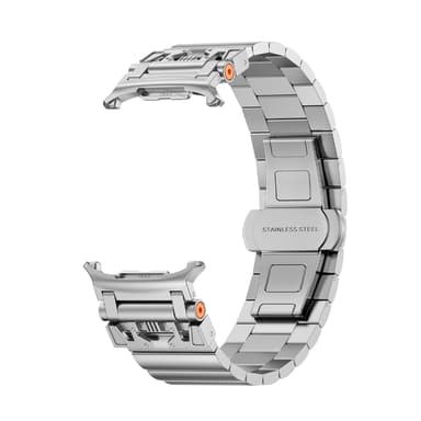 Premium ruostumaton teräs: Valmistettu korkealaatuisesta ruostumattomasta teräksestä, tämä kellon ranneke tarjoaa poikkeuksellista lujuutta ja joustavuutta, mikä takaa Samsung Galaxy Watch Ultra -kellollesi pitkäkestoisen suorituskyvyn.