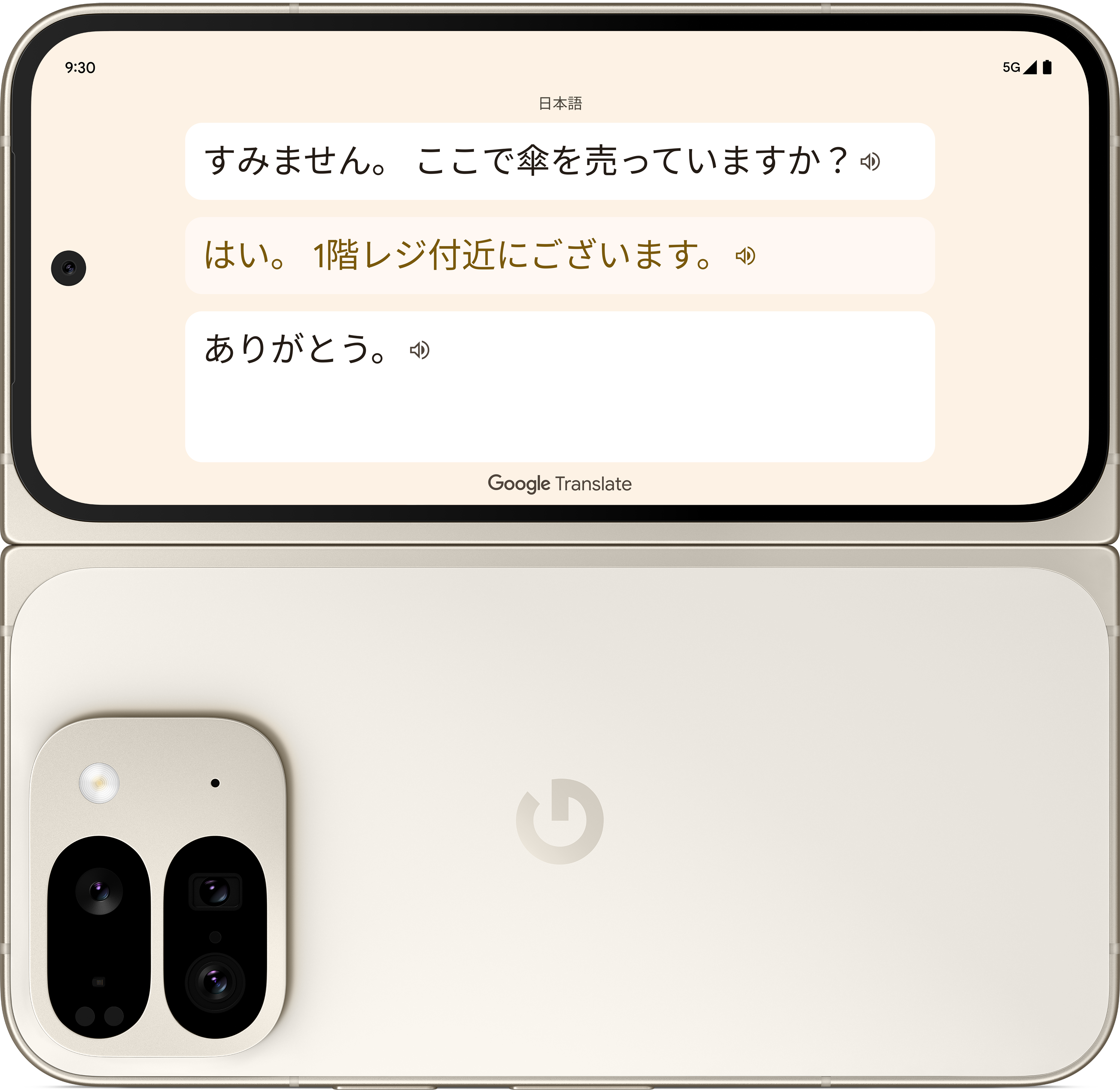 Google Kääntäjän avulla voit keskustella eri kielillä kasvotusten entistä helpommin. Dual Screen -tuen ansiosta käännökset näkyvät sekä sisä- että ulkonäytöllä.7