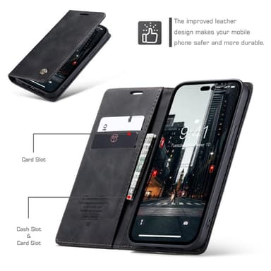 CASEME 013 -sarjan lompakkotoiminto PU-nahka+TPU-matkapuhelimen kuori Automaattisesti imeytyvä magneettinen sulkukotelo iPhone 14 Pro Maxille - musta Premium PU-nahka ja pehmeä TPU-sisäkotelo tarjoaa herkän kä den tuntuisen lompakon muotoilu: 2 korttTutustu ominaisuuksiin