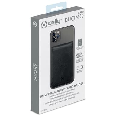 Celly Duomo Card on käytännöllinen magneettikorttikotelo keinonahkaa, joka on varustettu 4 korttitaskulla, joiden avulla voit kuljettaa kortteja ja rahaa kantamatta lompakkoasi.