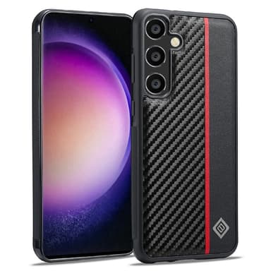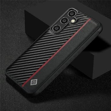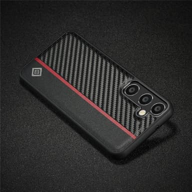 TPU + EVA 2-in-1 hybridi pohjakotelo, kestävä ja naarmuuntumaton. Hiilikuituteksturoitu pinta ja PU-nahkapäällyste, jossa punainen pystysuora raita, tyylikäs ulkonäkö. Alumiiniseoslogolla korostetaan korkeaa laatua.