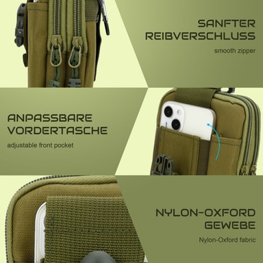Cadorabon taktinen matkapuhelinkassi maastokuvassa sopii erinomaisesti ulkoilijoille. Se on 185 mm korkea ja 125 mm leveä, ja siinä on tilaa jopa 6,7 tuuman älypuhelimille. Se on ihanteellinen patikointiin, retkeilyyn, lenkkeilyyn ja muihin ulkoilma-aktiviteetteihin, ja se pitää tärkeät tavarasi turvassa ja käden ulottuvilla.