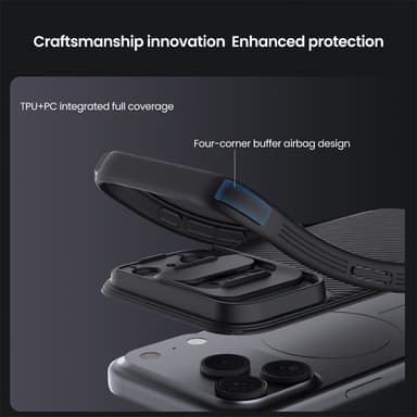 Camshield Pro on kestävä ja tyylikäs suojakuori, joka on valmistettu korkealaatuisista PC- ja TPU-materiaaleista ja tarjoaa 360 asteen suojan naarmuja, iskuja ja päivittäistä kulumista vastaan. Klassinen pintatekstuuri on kulutusta kestävä, liukumaton, pölyä hylkivä ja sormenjälkiä estävä, mikä takaa miellyttävän otteen ja siistin ulkonäön. Sisäänrakennettu magneettirengas mahdollistaa helpon käytön langattomien latureiden, magneettisten pidikkeiden ja autokiinnikkeiden kanssa, ja se on yhteensopiva MagSafe-laturin kanssa. Liukuva kameransuoja suojaa linssiä ja lisää yksityisyyttä. Liukumattomat sivut parantavat otetta, ja korotettu reuna suojaa kameraa entistä paremmin. Tarkat leikkaukset takaavat helpon pääsyn kaikkiin toimintoihin.