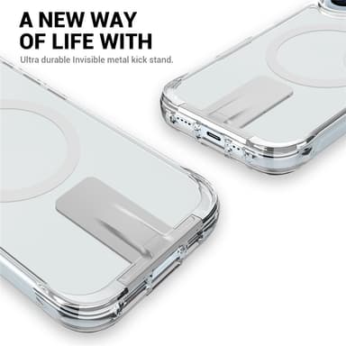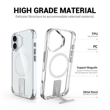 Tämä läpinäkyvä suojakuori yhdistää tyylin ja käytännöllisyyden. Sisäänrakennettu magneettirengas tukee langatonta latausta ja on täysin yhteensopiva MagSafe-lisävarusteiden kanssa. Valmistettu TPU:sta ja PC:stä, tarjoten kestävän suojan iskuilta ja pudotuksilta. Kirkas materiaali korostaa puhelimen alkuperäistä ulkonäköä. Alumiiniseoksesta valmistettu jalusta mahdollistaa vaivattoman katselun sekä vaaka- että pystyasennossa. Korotetut reunat suojaavat näyttöä ja kameraa naarmuilta ja iskuilta.