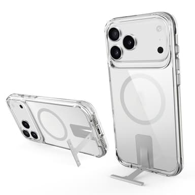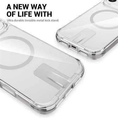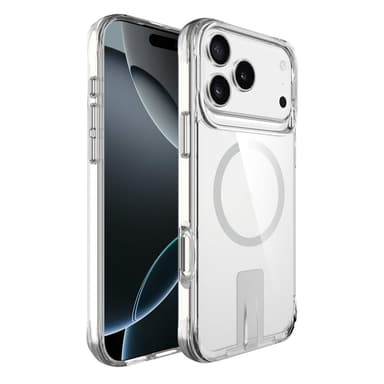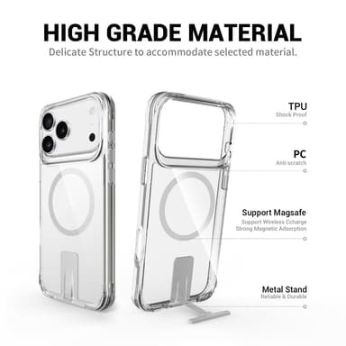 Tämä läpinäkyvä suojakuori yhdistää tyylin ja käytännöllisyyden. Sisäänrakennettu magneettirengas tukee langatonta latausta ja on täysin yhteensopiva MagSafe-lisävarusteiden kanssa. Valmistettu TPU:sta ja PC:stä, tarjoten kestävän suojan iskuilta ja pudotuksilta. Kirkas materiaali korostaa puhelimen alkuperäistä ulkonäköä. Alumiiniseoksesta valmistettu jalusta mahdollistaa vaivattoman katselun sekä vaaka- että pystyasennossa. Korotetut reunat suojaavat näyttöä ja kameraa naarmuilta ja iskuilta.