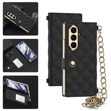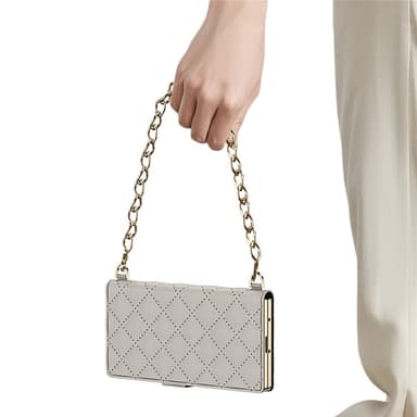 Tämä tyylikäs puhelinlompakko on valmistettu laadukkaasta PU-nahasta, jossa on timanttitikattu kuvio, tarjoten sekä suojaa että muodikkuutta. Sisäänrakennettu karkaistu lasisuoja suojaa näyttöä naarmuilta ja kulumiselta säilyttäen samalla kirkkauden. Käytännölliset kortti- ja setelitaskut sekä läpinäkyvä henkilökortti-ikkuna tarjoavat kätevää säilytystilaa. Käännettävä kansi toimii myös jalustana, mahdollistaen handsfree-katselun videoille ja kokouksille. Irrotettava kullanvärinen ketjuhihna mahdollistaa kantamisen olkalaukkuna tai käsilaukkuna.