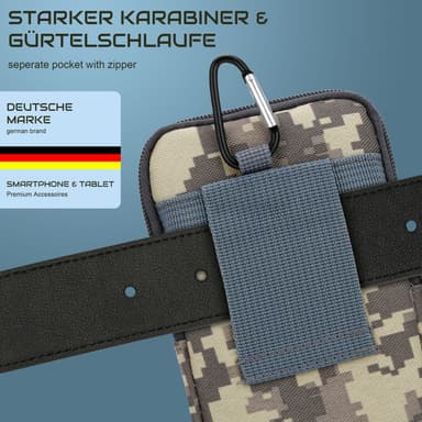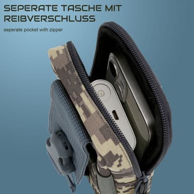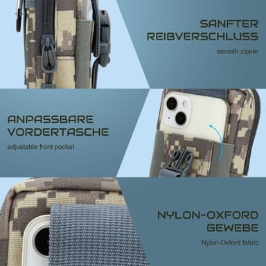 Cadorabon taktinen matkapuhelinkassi maastokuvassa sopii erinomaisesti ulkoilijoille. Se on 185 mm korkea ja 125 mm leveä, ja siinä on tilaa jopa 6,7 tuuman älypuhelimille. Se on ihanteellinen patikointiin, retkeilyyn, lenkkeilyyn ja muihin ulkoilma-aktiviteetteihin, ja se pitää tärkeät tavarasi turvassa ja käden ulottuvilla.