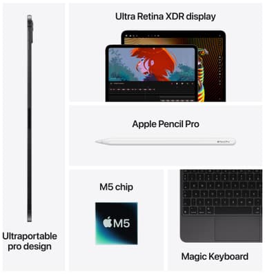 13" iPad Pro -tabletin avulla voit helposti ilmaista luovuuttasi tehokkaan Apple M5 -prosessorin, Ultra Retina XDR OLED -näytön, ProMotion-tekniikan ja 12 megapikselin takakameran ProRes-tuella.Tutustu ominaisuuksiin