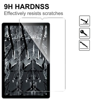 Kestävä ja naarmuuntumaton karkaistua lasia oleva näytönsuoja, jonka kovuus on 9H.