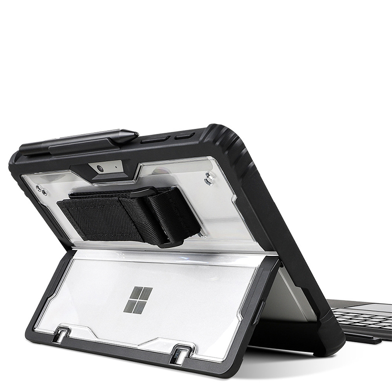 Toiminnallinen muotoilu: Suojauksen lisäksi tämä kotelo on suunniteltu toiminnallisuus mielessä pitäen. Sisäänrakennetun jalustan ansiosta voit tukea Surface Prota useissa katselukulmissa, mikä tekee siitä ihanteellisen videoiden katseluun, videoneuvotteluihin tai työskentelyyn liikkeellä ollessasi. Tarkat leikkaukset mahdollistavat helpon pääsyn kaikkiin portteihin, painikkeisiin ja ominaisuuksiin estämättä laitteen toimivuutta. Läpinäkyvä takaosa korostaa Surface Pron tyylikästä muotoilua, kun taas mustat reunat lisäävät ripauksen tyylikkyyttä. Kotelo edistää myös ilmanvaihtoa estäen ylikuumenemisen pitkäaikaisen käytön aikana.