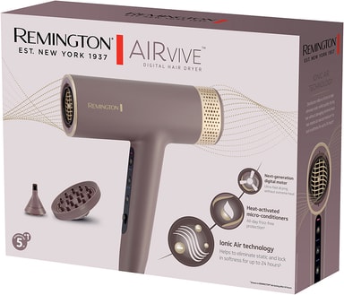 Remington AIRvive -hiustenkuivaaja tarjoaa tehokkaan ilmavirran ja pörröisyyden hallinnan ioniteknologialla. 12 lämpötila-/nopeusasetusta ja 360° magneettiset lisäosat helpottavat sileiden ja kiharoiden hiustyylien luontia.Tutustu ominaisuuksiin