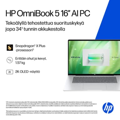 16" HP OmniBook 5 16 Snap-8C/16/512/OLED Copilot+ PC -kannettava tarjoaa tekoälyohjatun suorituskyvyn, jopa 34 tunnin akunkeston, kasvojentunnistuksen ja upean 2K OLED -näytön, ja kaikki tämä ohuessa, kannettavassa muodossa.Tutustu ominaisuuksiin