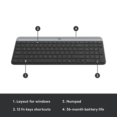 Logitech MK470 Slim Combo -pakkaukseen sisältyy ohut näppäimistö ja pienikokoinen Pebble M350 -hiiri. Pienikokoiset laitteet kulkevat helposti mukanasi, ja voit käyttää niitä missä tahansa langattomuuden ja hiljaisen toiminnan ansiosta.Tutustu ominaisuuksiin