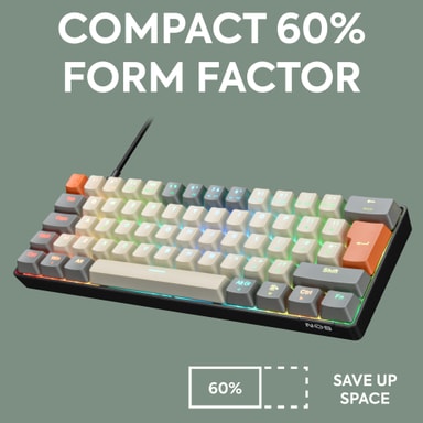 Lisää väriä pelilaitteistoosi ja säästä tilaa uhraamatta toimintoja NOS C-450 Mini PRO RGB -näppäimistöllä erityisillä näppäinhatuilla. Tavallista näppäimistöä 40 % pienempi laite sisältää 62 näppäintä, punaiset Outemu-kytkimet sekä RGB-valot.Tutustu ominaisuuksiin