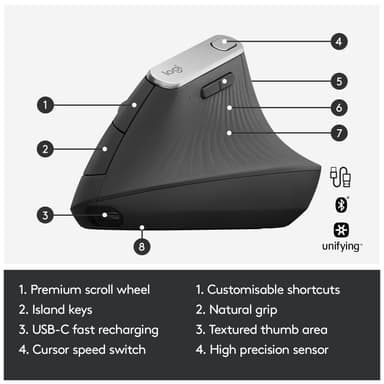 Logitech MX Vertical -hiiri on ergonominen valinta. Hiiren 57° kulma auttaa pitämään kättä luonnollisessa kädenpuristusta muistuttavassa asennossa. Vertikaalisessa hiiressä on 4000 DPI resoluutio ja se vähentää käteen kohdistuvaa rasitusta.Tutustu ominaisuuksiin