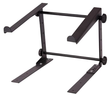 Kannettavan tietokoneen teline, sopii erityisesti muusikoille ja DJ:lle.  Kannettava ja helppo koota.  Neljä korkeussäätöä.  Kolme leveyssäätöä.  Mattamusta pulverimaalaus estää naarmuja. Tutustu ominaisuuksiin
