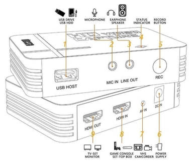 Liitä videolähde tuloon, HDMI-lähtö televisioon, aseta USB-laite, käynnistä se, aloita tallennus yhdellä napsautuksella ja napsauta uudelleen tallentaaksesi videotiedoston USB-laitteeseen. Ei tietokonetta, ei ohjaimen asennusta, ei ohjelmistoa, ei asetuksia, vain yksi napsautus.