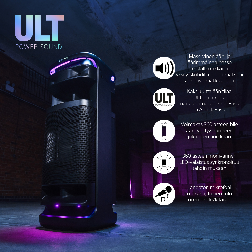 Vuosikymmenten Sony-ääniasiantuntemukseen perustuva ULT TOWER 10 antaa sinulle mahdollisuuden kokea klubin äänentoiston kaikkialla. Jättimäinen X-Balanced-kaiutinyksikkö on muotoiltu ainutlaatuisella tavalla laulun selkeyden ja järisyttävän basson tehostukseen. Korkealaatuiset diskanttiäänet puolestaan levittävät äänen juhlatilan jokaiseen nurkkaan.