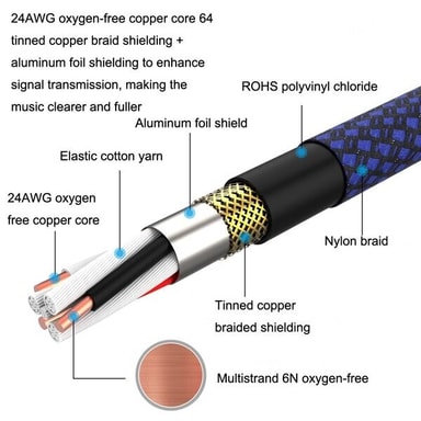 Mikrofonikaapelimme on valmistettu puuvilla- ja nailonseoksesta, mikä tekee siitä kestävän ja pitkäikäisen. Metallikuori on elektrolyyttisesti päällystetty sekä kauniuden että kestävyyden vuoksi ja häiriöiden välttämiseksi. Kaapelissa on 24AWG hapoton kuparilanka, jossa on 64 tinattua kuparipunosta + alumiinifoliopunokset signaalin siirron parantamiseksi, mikä tekee musiikista selkeämpää ja täyteläisempää. Lisäksi nailonverkko parantaa kaapelin vetolujuutta ja kestävyyttä. Kaapeli on pehmeä, kestävä, hyönteis- ja purentakestävä.