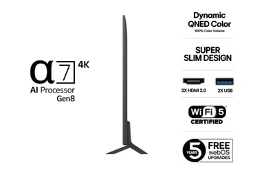 QNED80 yhdistää α7 Gen8 4K AI -prosessorin ja QNED evo -värit, tarjoten tarkat värit ja kontrastin. Local Dimming ja HDR10 Pro parantavat kuvan, ja 29 mm ohut muotoilu sekä säädettävä jalusta tekevät siitä sopivan kaikkiin tiloihin.Tutustu ominaisuuksiin