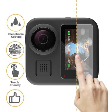 Naarmuuntumaton ja särkymätön: Alan johtavan 9H-kovuutensa ansiosta näytönsuoja tarjoaa tehokkaan suojan naarmuja, kolhuja ja muita jokapäiväisiä vaurioita vastaan. GoPro MAX -kamerasi näyttö pysyy turvassa myös ankarissa olosuhteissa.