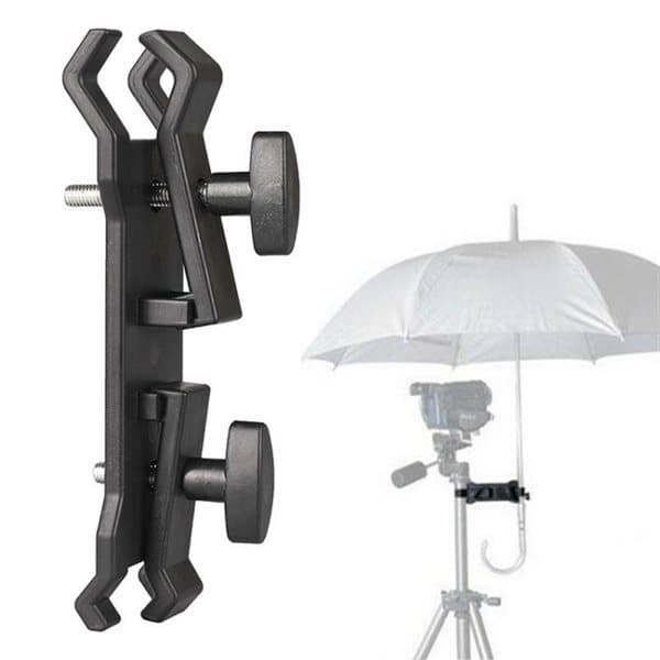 Pidike sateenvarjolle, joka voidaan kiinnittää kameran jalustaan. Suojaa kamera voimakkaalta valolta ja saat hyviä kuvia sateenvarjon kanssa. Tämä pidike pitää varjon tukevasti paikallaan optimaalisten kuvien saamiseksi.