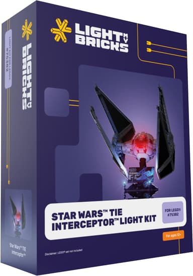 Light My Bricks™ Star Wars TIE Interceptor -valosarja täydentää LEGO® #75382 -mallia seitsemällä LED-valolla, jotka on varustettu nauhamaisilla kaapeleilla helpottamaan asennusta. Valot korostavat siipiä, ohjaamoa, laserkanuunoita ja moottoreita.Tutustu ominaisuuksiin