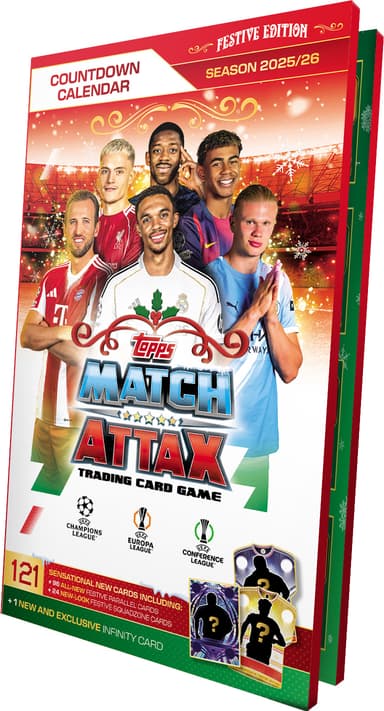 Topps Match Attax Champions League -joulukalenteri sisältää 97 Match Attax -korttia, mukaan lukien 24 eksklusiivista Festive/Squadzone-korttia ja yhden taatun eksklusiivisen Limited Edition -kortin. Se sisältää päivittäisen tietokilpailun/tehtävän.Tutustu ominaisuuksiin