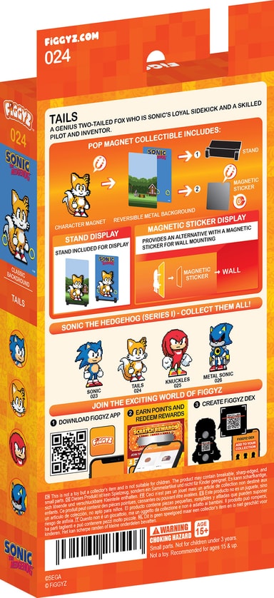 First 4 Figures FiGGYZ Sonic the Hedgehog -hahmomagneetti sisältää käännettävän metallisen takalevyn, joka tarjoaa kaksi esillepanovaihtoehtoa, pikselitaidetyylisen hahmon, 3D-pop-out-efektin, esillepanopohjan ja magneettisen tarran.Tutustu ominaisuuksiin