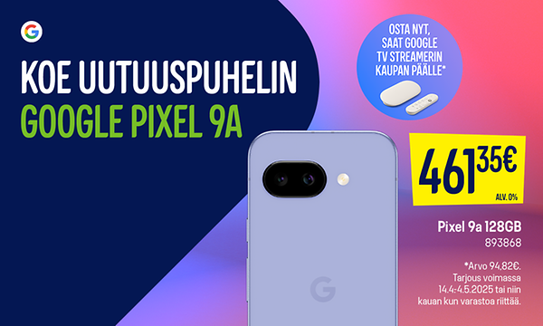 Tässä on Pixel 9a. Googlen suunnittelema älypuhelin tarjoaa enemmän kuin odotat ja edullisemmin kuin uskotkaan. Gemini-tekoälyavustaja lisää tuottavuutta ja luovuutta. Upea kamera tallentaa uskomattomat kuvat. Koko päivän kestävä akku. Kestävä muotoilu. Päivityksiä seitsemän vuoden ajan, joten puhelin tuntuu aina uudelta. Kaikki halvemmalla kuin uskotkaan.