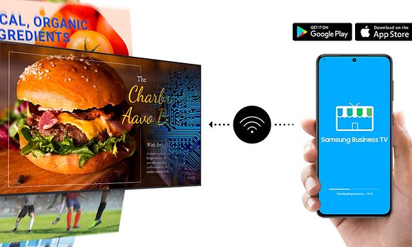Samsung Business TV -mainoskuvassa tv-näyttö kahvilassa ja henkilö, joka ohjaa näyttöä sovelluksella
